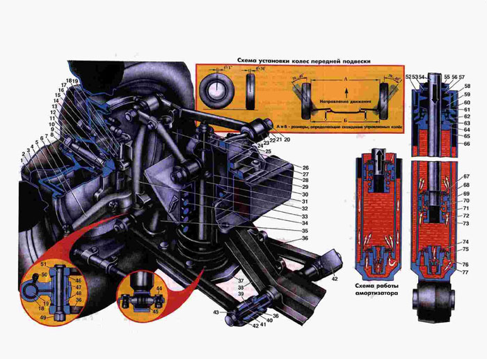 1 Диск колеса. 2. Колпак колеса. 3. Барабан тормоза. 4. Колодка тормоза. 5. Щит тормоза. 6. Рычаг поворотного кулака. 7. Ступица. 8. Внутренний подшипник ступицы. 9. Гайка. 10. Защитный колпак. 11. Шайба. 12. Наружный подшипник ступицы. 13. Поворотный кулак. 14. Сальник. 15. Болт крепления колеса. 16. Уплотнитель упорного подшипника. 17. Упорный подшипник. 18. Игольчатый подшипник шкворня. 19. Шкворень. 20. Гайка. 21. Сферическа» шайба. 22. Резиновая втулка. 23. Верхний рычаг подвески. 24. Ось верхнего рычага 25. Чашка. 26 Резиновая втулка. 27 Буфер отдачи. 28. Планка крепления оси. 29. Планка крепления подвески. 30. Защитный колпак. 31. Амортизатор. 32. Резиновая подкладка пружины. 33. Стойка. 34. Пружина. 35. Буфер сжатия. 36. Нижний рычаг подвески. 37. Опорная чашка пружины. 38. Поперечина передней подвески. 39.Распорнан втулка. 40. Палец. 41. Резиновая втулка. 42. Стопорная планка. 43. Сферическая шайба. 44. Болт. 45. Нижний шарнир амортизатора. 46. Уплотнительное кольцо. 47. Резьбовая втулка. 48. Распорная втулка. 49. Гайка. 5 0. Пресс-масленка. 51. Палец. 52. Гайка резервуара. 53. Обойма сальника. 54. Шток поршня. 55. Защитное кольцо. 56. Прокладка. 57. Наружный сальник штока. 58. Обойма сальника. 59. Внутренний сальник штока. 60. Шайба. 61. Обойма. 62. Пружина. 63. Уплотнительное кольцо. 64. Надавливающая втулка. 65. Цилиндр. 66. Резервуар. 67. Перепускной клапан. 68. Перепускное отверстие. 69. Поршневое кольцо. 70. Клапан отдачи. 71. Поршень. 72. Пружина. 73. Гайка. 74. Перепускной клапан. 75. Перепускное отверстие. 76. Корпус клапана сжатия. 77. Клапан сжатия. |