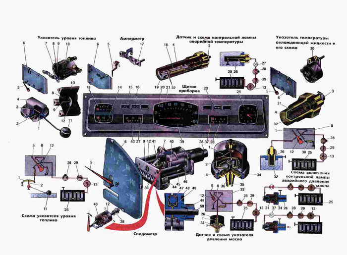 Автомобиль оборудован щитком приборов КП126, в котором помещены амперметр, указа- тель уровня топлива, указатель температуры охлаждающей жидкости, контрольная лампа пре- дельной температуры охлаждающей жидкости, спидометр, указатель давления масла, конт- рольная лампа аварийного давления масла, ча- сы, контрольная лампа указателей поворота, контрольная лампа включения "дальнего света" и контрольная лампа стояночного тормоза. Включение приборов осуществляется через вы- ключатель зажигания. Амперметр. Амперметр показывает силу зарядного или разрядного то- ка в цепи аккумуляторной батареи. Амперметр является магнита-электрическим прибором. По- стоянный магнит, установленный на токоведу- щей шине 17, удерживает стрелку в вертикаль- ном положении (нулевое положение на шкале). Ток, проходя по токоведущей шине 17, создает вокруг нее свое магнитное поле. При взаимо- действии двух магнитных полей создается ре- зультирующее магнитное поле, которое от- клоняет стрелку в ту или другую сторону на разные углы в зависимости от силы тока, про- ходящего через шину. Отклонение стрелки в сторону "+" или "-" зависит от направления результирующего поля, которое зависит от на- правления тока, протекающего по шине к акку- муляторной батарее или от нее. Указатель уровня топлива. В щитке приборов установлен электромагнитный указатель уровня топлива ло- гометрического типа. Прибор состоит из указателя, расположенного в щитке приборов, и датчика БМ139-k, установленного в бензино- вом баке. Указатель представляет собой элек- тромагнитный ло- гометр с неподвижными изме- рительными катушками и подвижным постоянным магнитом 12. Магнит укреплен на оси стрелки указателя. Катушки указателя намотаны под углом 90' на специальном пластмассовом кар- касе. Каркас с катушками и магнитом помещен в специальный экран 7 (от воздействия на них посторонних магнитных полей). При протекании тока по обеим катушкам создается ре- зультирующее магнитное поле. Постоянный маг- нит, взаимодействуя с магнитным полем кату- шек, устанавливается в положение, зависящее от направления этого поля. Направление ре- зультирующего магнитного поля зависит от из- менения отношения токов в катушках, которое определяется величиной сопротивления датчи- ка, зависящего, в свою очередь, от количест- ва бензина в баке. Для уменьшения влияния температуры на точность показания прибора одна из катушек соединена с "массой" через резистор, являющийся температурным компенсатором. Датчик указателя БМ139-К представляет собой переменный резистор, смонтированный в металлической коробке. Дат- чик изменяет сопротивление в зависимости от уровня топлива в баке, так как его подвижной контакт связан с рычагом, на конце которого установлен поплавок. Указатель температуры охлаждающей жидкости. Для контроля темпера- туры охлаждающей жидкости двигателя применя- ется электромагнитный указатель Лого- метри- ческого типа. Прибор состоит из указателя, расположенного в щитке приборов, и датчика ТМЮО, установленного в головке блока двига- теля. Устройство аналогично указателю уровня топлива, а датчик представляет собой полу- проводниковый терморезистор 32, который рез- ко меняет собой сопротивление в зависимости от изменений температуры. Изменение темпера- туры охлаждающей жидкости вызывает резкое изменение сопротивления 