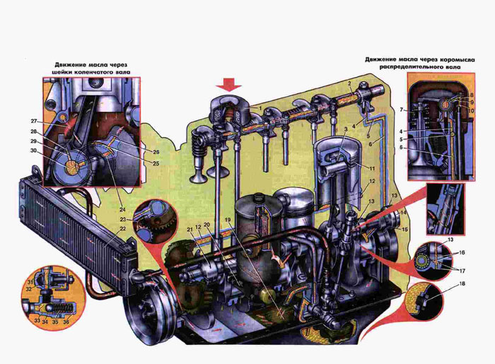 коромысел и верхние наконечники штанг толкателей. Остальные детали смазываются разбрызгиванием маслом. В систему смазки входят