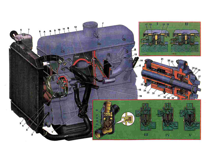 1. Термостат. 2. Ремень вентилятора. 3. Насос системы охлаждения двигателя. 4. Вентилятор. 5. Радиатор. 6. Пробка наливной горловины радиатора. 7. Расширительный бачок. 8. Шланг подвода жидкости к радиатору. 9. Уплотнительная манжета сальника. 10. Датчик указателя температуры охлаждающей жидкости. 11. Кран отопителя. 12. Отводной шланг подогрева впускной трубы. 13. Впускная труба. 14. Шланг подвода жидкости к радиатору отопителя. 15. Трос управления краном отопителя. 16. Шланг отвода жидкости из радиатора отопителя. 17 Уплотнительная прокладка пробки наливной горловины 18. Пружина пробки. 19. Впускной клапан с резиновой прокладкой. 20. Выпускной клапан с резиновой прокладкой. 21. Распорная втулка шарикоподшипников. 22. Упорное кольцо. 23. Уплотнительная шайба. 24. Обойма манжеты. 25. Кольцо манжеты. 26. Поджимная пружина. 27. Крыльчатка насоса. 28. Манжета. 29. Стопорное кольцо. 30. Втулка насоса. 31. Стопорный винт. 32. Корпус насоса. 33. Опорная втулка наружных колец шарикоподшипников. 34. Ступица шкива привода насоса и вентилятора. 35. Валик крыльчатки. 36. Верхний клапан. 37. Подвижный сердечник термостата. |