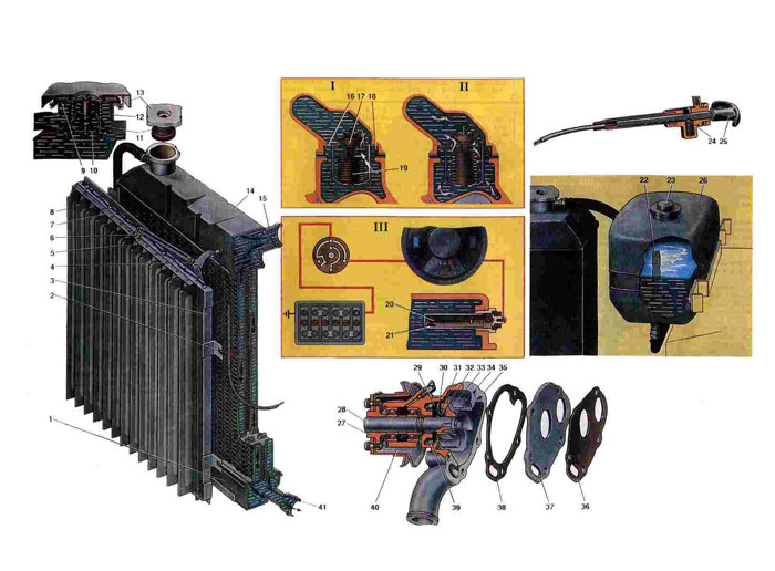 1. Нижний бачок радиатора. 2. Сердцевина *адиа-тора. 3. Рамка жалюзи. 4. Рычаг управления жалюзи. 5. Планка шарнирного соединения пластин. 6. Тяга поворота пластин-створок жалюзи. 7. Ось вращения пластины-створки жалюзи. 8. Пластина-створка жалюзи. 9. Уплотнительная прокладка пробки радиатора. 10. Впускной клапан. 11. Выпускной клапан. 12. Пружина выпускного клапана. 13. Пробка. 14. Верхний бачок радиатора 15. Подводной патрубок радиатора. 16. Фланец термостата. 17. Клапан термостата. 18. Опорное кольцо термостата. 19. Датчик термостата (гофрированный баллон). 20. Биметаллическая пластина с обмоткой. 21. Неподвижный контакт. 22. Трубка расширительного бачка. 23. Пробка расширительного бачка. 24. Шарик фиксатора. 25. Рукоятка управления жалюзи радиатора. 26. Расширительный бачок. 27. Ступица крепления шкива и вентилятора. 28. Вал крыльчатки. 29. Уплотнительная шайба сальника. 30. Обойма уплотнительной манжеты. 31. Пружина самоподжимного сальника. 32. Резиновая манжета сальника. 33. Упорное кольцо манжеты сальника. 34. Крыльчатка. 35. Корпус насоса. 36. 38. Паронитовые прокладки. 37. Пластина водяного насоса. 39. Пружинное стопорное кольцо. 40. Шкив привода водяного насоса. 41. Отводной патрубок радиатора. |