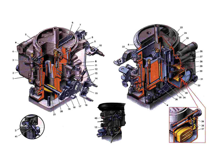 1. Большой диффузор. 2. Малый диффузор. 3. Рычаг управления воздушной заслонкой. 4. Топливный жиклер переходной системы. 5. Эконостат. 6. Воздушная заслонка. 7. Ось воздушной заслонки. 8. Топливопроводящий винт блока распылителей. 9. Винт крепления блока распылителей. 10. Рычаг привода воздушной заслонки. 11. Выпускной клапан ускорительного насоса. 12. Упорный винт, ограничивающий прикрытие дроссельной заслонки. 13. Пружина, отжимающая кулису 17 вверх. 14. Рычаг привода дроссельной заслонки основной смесительной камеры. 15. Возвратная пружина. 16. Поводок. 17. Кулиса. 18. Палец. 19. Рычаг привода оси дроссельной заслонки. 20. Ось дроссельной заслонки дополнительной смесительной камеры. 21. Дроссельная заслонка дополнительной смесительной камеры. 22. Топливный жиклер системы холостого хода. 23. Планка привода ускорительного насоса и экономайзера. 24. Пружина ускорительного насоса. 25. Возвратная пружина планки. 26. Направляющая штока экономайзера. 27. Главный воздушный жиклер. 28. Эмульсионная трубка. 29. Клапан экономайзера. 30. Стекло смотрового окна. 31. Пробка, открывающая доступ к главному топливному жиклеру. 32. Прижимная гайка. 33. Шток привода клапана экономайзера и поршня ускорительного насоса. 34. Прокладка карбюратора. 35. Соединительная серьга. 36. Рычаг привода ускорительного насоса и экономайзера. 37. Поплавок. 38. Топливный клапан. 39. Топливный фильтр. 40. Тяга, связывающая рычаги на осях воздушной и дроссельной заслонок. 41. Подпружиненное устройство для пуска холодного двигателя. |