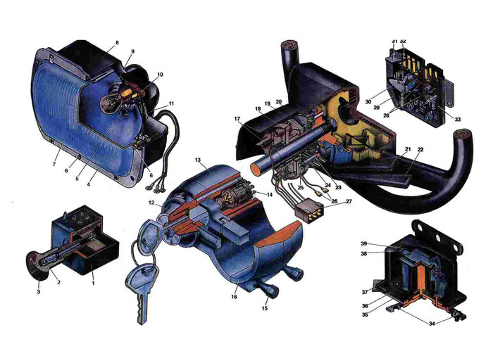 1. Выключатель аварийной сигнализации. 2. Лампа. 3. Ручка выключателя. 4. Ободок. 5. Лампа света стоянки. 6. Регулировочный винт. 7. Рассеиватель. 8. Пластмассовый кожух. 9. Лампа ближнего и дальнего света. 10. Соединительная колодка лампы ближнего и дальнего света. 11. Рефлектор. 12. Выключатель (замок) зажигания. 13. Кронштейн выключателя зажигания. 14. Контактное устройство. 15. Болт крепления кронштейна. 16. Крышка кронштейна. 17. Пружина сухаря. 18. Основание переключателя. 19. Сектор возврата рычага переключения указателей поворота. 20. Шайба включения указателей поворота. 21. Рычаг переключения указателей поворота. 22. Рычаг переключения света фар. 23. Ось рычагов. 24. Пружина фиксатора рычага переключения света фар. 25. Шарик фиксатора. 26. Соединительные штекеры. 27. Соединительная колодка. 28. Реле контроля. 29. Корпус прерывателя. 30. Исполнительное реле. 31. Крышка прерывателя. 32. Выводные клеммы. 33. Печатная плата. 34. Выводные клеммы. 35. Основание реле. 36. Прокладка. 37. Корпус реле. 38. Пружина. 39. Пластина верхнего контакта. |