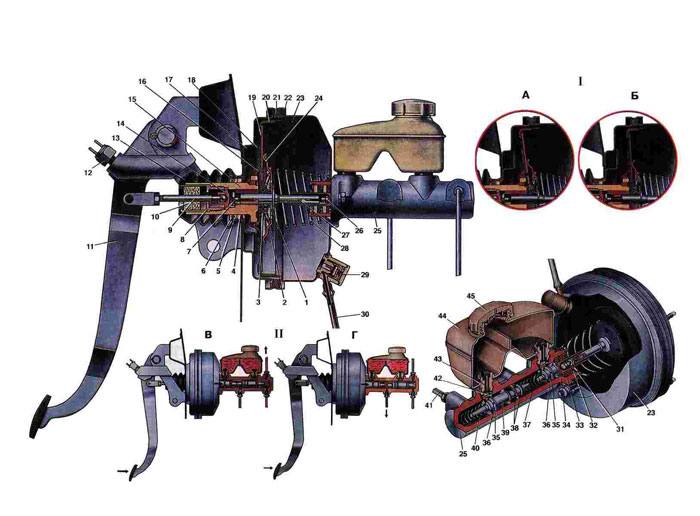 1. Центральный клапан. 2. Возвратная пружина клапана. 3. Фиксирующая шайба. 4. Направляющее кольцо. 5. Манжета. 6. Стопорное кольцо. 7. Регулировочный винт. 8. Прижимная втулка. 9. Толкатель поршня. 10. Воздушный фильтр. 11. Педаль тормоза. 12. Выключатель сигнала торможения. 13. Защитный чехол. 14. Опора толкателя. 15. Поршень усилителя. 16. Запорное кольцо. 17. Основание корпуса 18. Кольцевой упор. 19. Опорный диск. 20. Опорное кольцо. 21. Диафрагма. 22. Соединительное кольцо. 23. Крышка корпуса. 24. Опорная тарелка. 25. Корпус главного цилиндра. 26. Регулировочный болт. 27. Шток усилителя 28. Возвратная пружина. 29. Обратный клапан. 36. Шланг. 31. Стопорное кольцо. 32. Проставочная шайба. 33. Наружная манжета. 34. Поршень первой камеры. 35. Перепускной клапан. 36. Главная манжета. 37, 40. Возвратная пружина. 38. Разделительные манжеты 39. Поршень второй камеры. 41. Трубка гидропривода тормозов. 42. Упорный штифт. 43. Соединительная втулка. 44. Бачок. 45. Крышка бачка. |