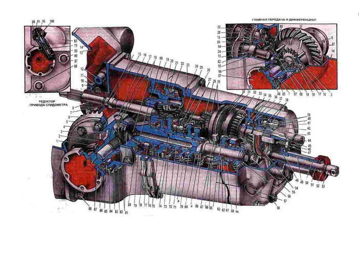 1. Подшипник дифференциала. 2. Ведущее зубчатое колесо редуктора привода спидометра 3. Коробка дифференциала. 4. Болт крепления ведомого зубчатого колеса главной передачи. 5. Шайба. 6. Ведомое зубчатое колесо главной передачи. 7. Манжета 8. Втулка направляющая 9. Подшипник выключения сцепления 10. Кожух подшипника. 11. Фланец подшипника 12. Вал выключения сцепления. 13. Сопло вентиляционное. 14. Картер сцепления 15. Первичный вал. 16. Палец сателлитов. 17. Сателлит 18. Зубчатое колесо полуоси. 19. Ось промежуточного зубчатого колеса передачи заднего хода 20. Промежуточное зубчатое колесо передачи заднего хода. 21. Втулка зубчатого колеса. 22. Вилка включения передачи заднего хода. 23. Прокладка картера. 24. Венец передачи заднего хода первичного вала. 25. Венец первой передачи первичного вала. 26. Пружина синхронизатора первой и второй передач. 27. Кольцо и блокирующий палец синхронизатора первой и второй передач. 28. Венец второй передачи первичного вала 29. Ведущее зубчатое колесо третьей передачи. 30. Кольцо и блокирующий палец синхронизатора третьей и четвертой передач. 31 Муфта синхронизатора третьей и четвертой передач. 32. Ведущее зубчатое колесо четвертой передачи 33. Прокладка крышки 34. Кольцо упорное подшипника 35. Задний подшипник первичного вала. 36. Ведущее зубчатое колесо пятой передачи 37. Пластина крепления подшипников 38. Муфта синхронизатора пятой передачи. 39. Кольцо и блокирующий палец синхронизатора пятой передачи 40. Упорная шайба ведущего зубчатого колеса пятой передачи. 41. Пружина синхронизатора пятой передачи. 42 Кольцо упорное пальцев синхронизатора 43. Кольцо упорное ведущего зубчатого колеса пятой передачи. 44.Ступица муфты синхронизатора пятой передачи 45.Подшипник ведущего зубчатого колеса пятой передачи. 46. Выключатель света заднего хода. 47. Плунжер выключателя. 48.Передняя направляющая втулка переключателя передач. 49. Крышка картера. 50. Задняя направляющая втулка переключателя передач 51. Кольцо уплотнительное переключателя передач. 52. Чехол грязезащитный. 53. Вал переключателя передач. 54. Рычаг переключателя передач. 55. Гайка крепления ведущего зубчатого колеса главной передачи. 56. Шайба гайки. 57. Заглушка. 58. Болт крепления крышки. 59. Ведомое зубчатое колесо пятой передачи. 60. Задний подшипник ведущего зубчатого колеса главной передачи. 61, 62. Шайбы регулировочные осевого положения ведущего зубчатого колеса главной передачи 63. Ведомое зубчатое колесо четвертой передачи. 64. Шпонка крепления зубчатого колеса на валу 65. Шток вилки включения третьей и четвертой передач 66.Шток вилки включения первой и второй передач 67. Вилка включения третьей и четвертой передач 68. Кольцо стопорное ведомого зубчатого колеса третьей передачи. 69. Пружина та рельчатая. 70. Ведомое зубчатое колесо третьей передачи. 71. Ведомое зубчатое колесо второй передачи. 72. Ступица муфты синхронизатора первой и второй передач. 73. Муфта синхронизатора первой и второй передач 74. Вилка включения первой и второй передач. 75. Ведомое зубчатое колесо первой пере дачи. 76. Ведомое зубчатое колесо передачи заднего хода. 77. Картер коробки передач. 78. Подшипник передний ведущего зубчатого колеса главной передачи 79. Стопорная пластина крепления подшипника. 80. Ведущее зубчатое колесо главной передачи (вторичный вал). 81. Кольцо стопорное фланца полуоси 82. Картер главной передачи. 83. Стопор ре