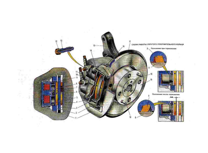 1. Рама. 2. Суппорт. 3. Диск. 4. Колодка тормоза. 5. Поршень (большой). 6. Корпус цилиндра 7. Грязезащитный чехол. 8. Поршень (малый). 9. Уплотнительное кольцо. 10. Фиксатор. 11. Гибкий шланг со штуцером. 12. Колпачок клапана. 13. Клапан выпуска воздуха. 14. Палец. 15. Поворотный кулак. 16. Пружина. 17. Щит. 18. Фиксатор. 19. Ступица колеса. |